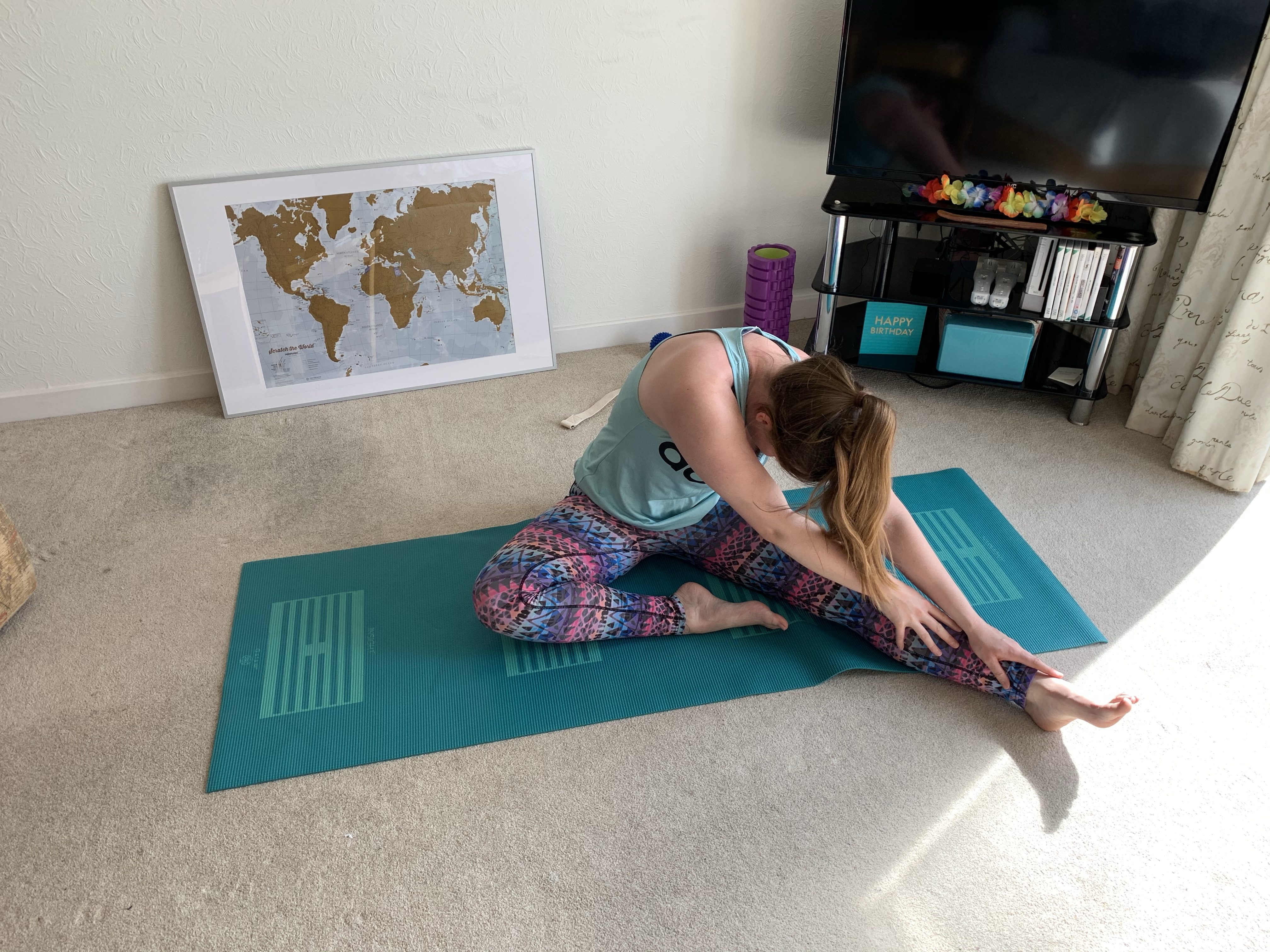 4. Is the same stretch again, although I have used a yoga strap to pull my leg closer and also to provide more of a stretch in the calf by pulling down on my foot. You can also use resistance bands or towels