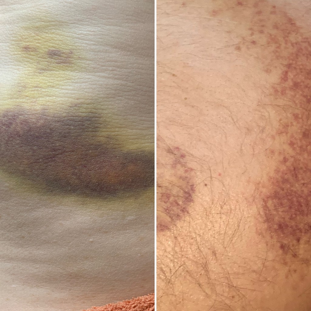 The difference is, bruises are the effect of injury or trauma to soft tissue (as above); whereas, Dry Cupping and IASTM marks are formed of stagnated blood that is remaining under the surface after treatment for the Lymphatic system to clear away. The two techniques are designed to draw blood to the surface for healing properties but depending on the area of the body, it can take longer to fade away.